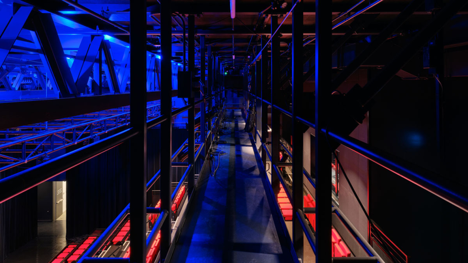 The performance hall offers notable versatility thanks to its motorized retractable seating system. The main configuration seats 310 people and is complemented by several smaller layouts that can accommodate a variety of staging possibilities. This flexibility fosters more dynamic and intimate relationships between artists and audiences, ensuring that the space remains closely aligned with the artistic works it brings to life.
