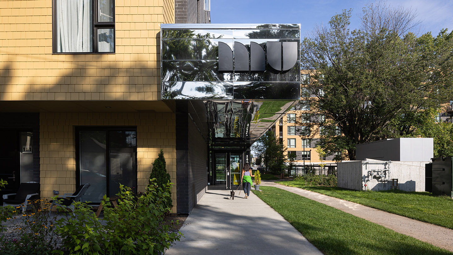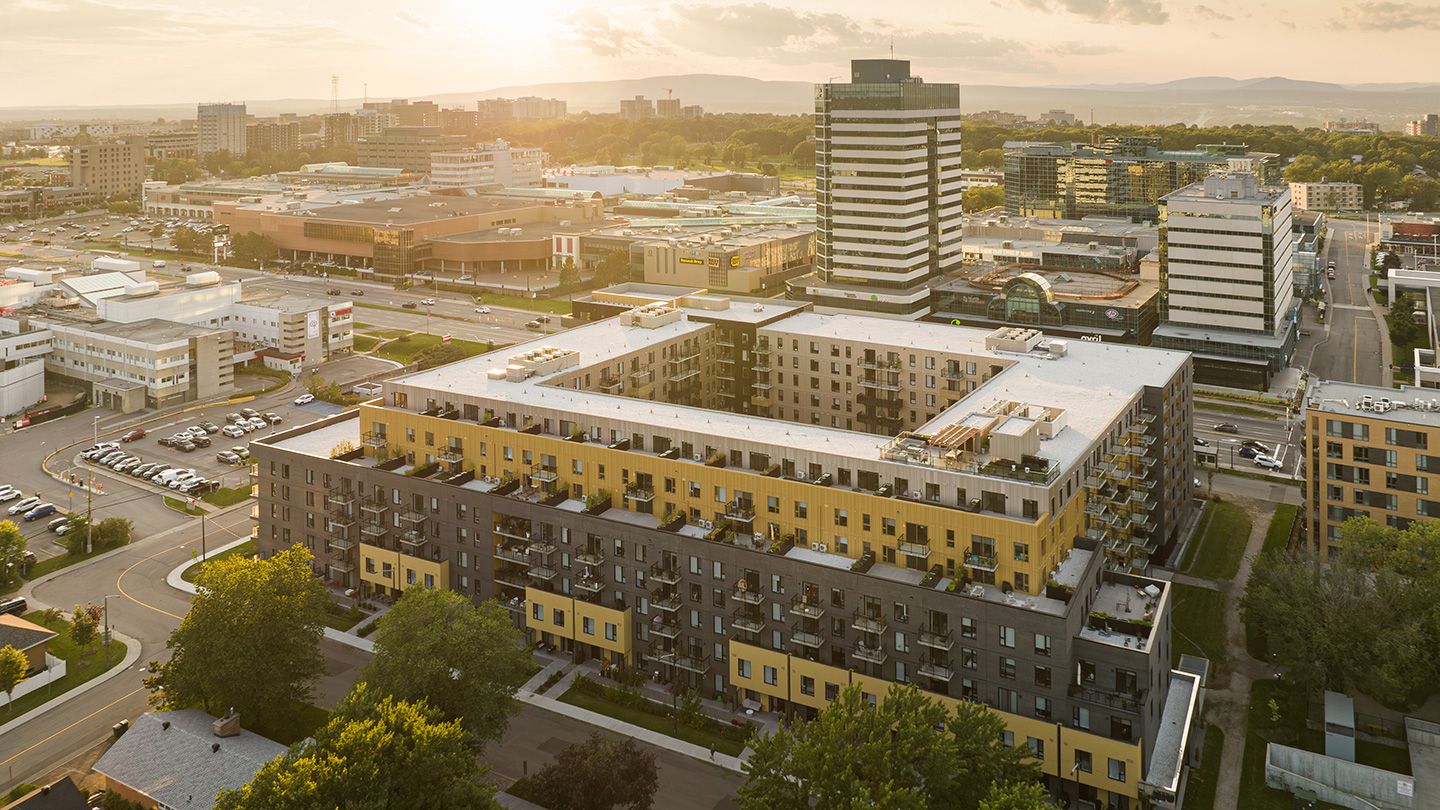 Parmi les mesures intégrées : une ambiance sonore et visuelle soignée dans les aires communes, des murales de l’artiste Roger aux étages, ainsi qu’une mise en couleurs distinctive des stationnements.