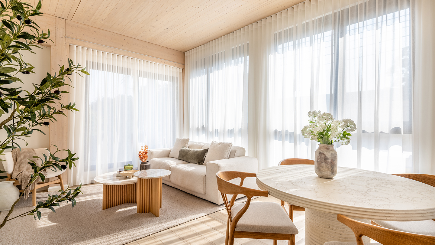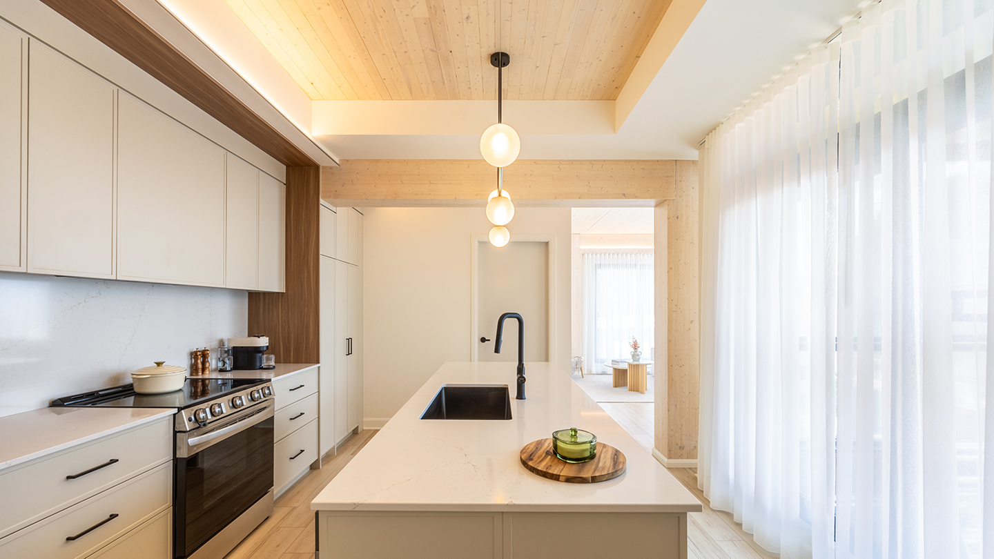L’un des choix fondamentaux du projet réside dans la volonté de laisser la structure en bois apparente, mettant en avant ses qualités biophiliques et esthétiques. Confort, chaleur et pérennité : autant d’atouts qui rehaussent la qualité de vie des résidents. L’ensemble des 53 unités locatives est habillé d’une essence de bois locale jusqu’aux éléments de finition, y compris le mobilier intégré. Cette approche assure l’intégrité de la structure tout en restant fidèle à l’idéologie du projet, garantissant une synergie parfaite entre fonctionnalité et design.